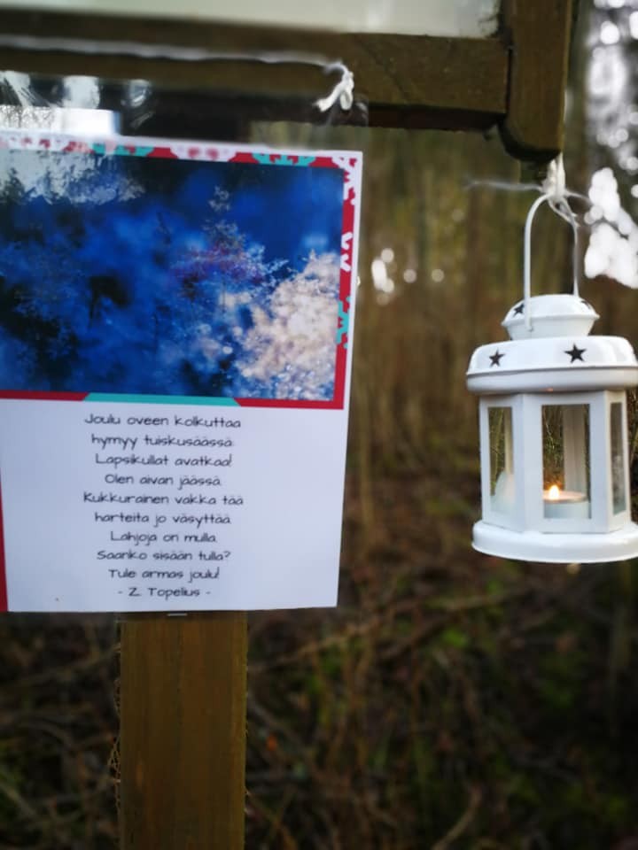 Kun olemme muuttaneet oikeasta talvimaasta tänne etelään niin jouluntuntua pitää hakea myös mielikuvina, täällä lumi ei välttämättä ole pysyvää vaan se käväisee hetken ja sitten sulaa pois. Kävimmekin mieheni kanssa ulkoilemassa yhtenä sunnuntaisena päivänä Nuuksion pohjoispuolella. Salmen ulkoilualueelle oli järjestetty joulumarkkinat ja joulupolku. Kun minä olen niin lapsenmielinen niin toki halusin sinne mukaan. Paikalla oli paljon lapsiperheitä ja myös pariskuntia. Kiersimme pienen kartanotontun joulupolun. Lunta ei ollut mutta polun varrella oli pieniä tauluja joista voi lukea juuri sen luontotyypin satuolennoista. Tämä pieni kierros on sopivan mittainen pienillekkin lapsille kierrettäväksi. Kartanon pihalla oli joulupukin aitta sekä pirtti jossa sai joulupuuroa. Pihan muissa pienissä aitoissa oli käsityöläisten tekemiä käsitöitä myytävänä. Sain joulutunnelman mukaani mutta mietin jo että kun kesä koittaa niin tänne kyllä tullaan uudelleen, niin kaunista oli näin joulukuun harmaudessakin kyseinen paikka.