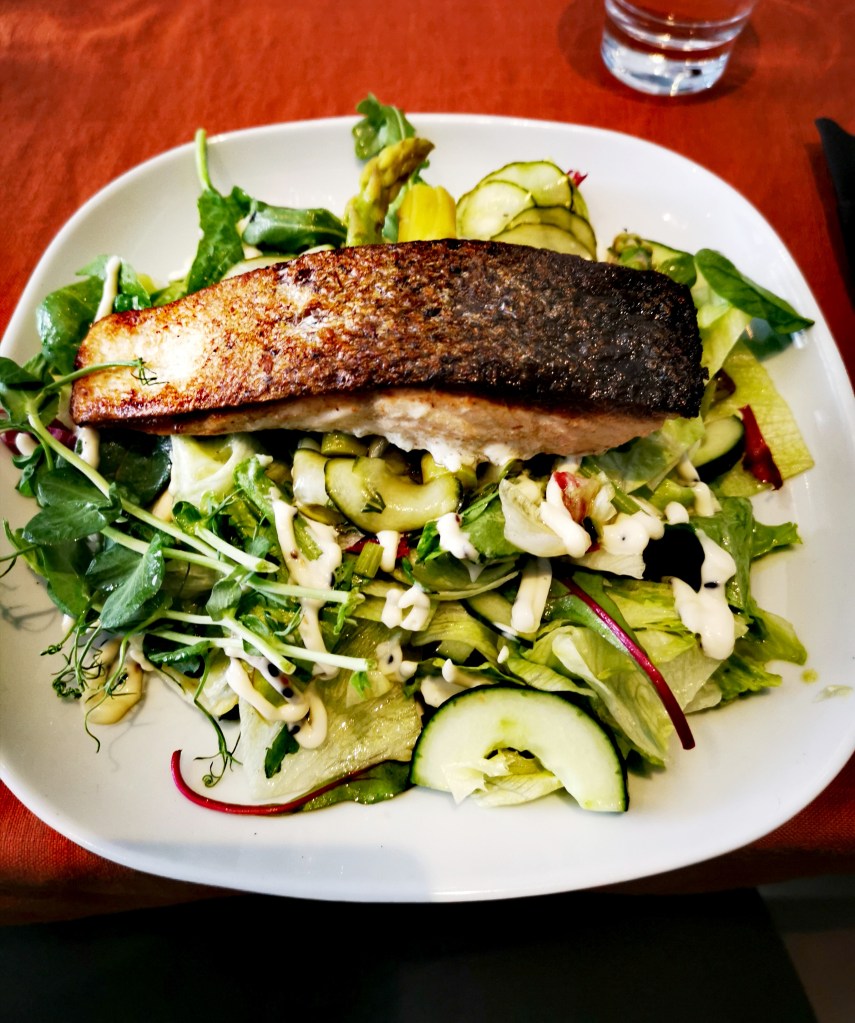 Paikaksi valikoitui Gapriel 1763. Tyttäreni kertoi että hän on täällä syönyt yhden parhaista pizzoista. Ravintolan miljöö oli idyllinen ja sisustus mukailtu vanhanajan tyyliin. Saimme pienen kahden hengen pöydän ja melkein heti iloinen tarjoilija tuli ottamaan tilauksen vastaan. Tyttäreni tilasi pitsan ja minä lohisalaatin. Myös minä maistoin pitsaa joka todella oli erilainen mitä tavallisesti. Pohja oli mukailtu pannukakku tyyliseksi ja herkulliset täytteet ja kastike kruunasi makuelämyksen. Minun lohiannos oli maukas ja reilun kokoinen. Tästä tulee kyllä yksi vaki käyntikohde kun taas täällä liikutaan.