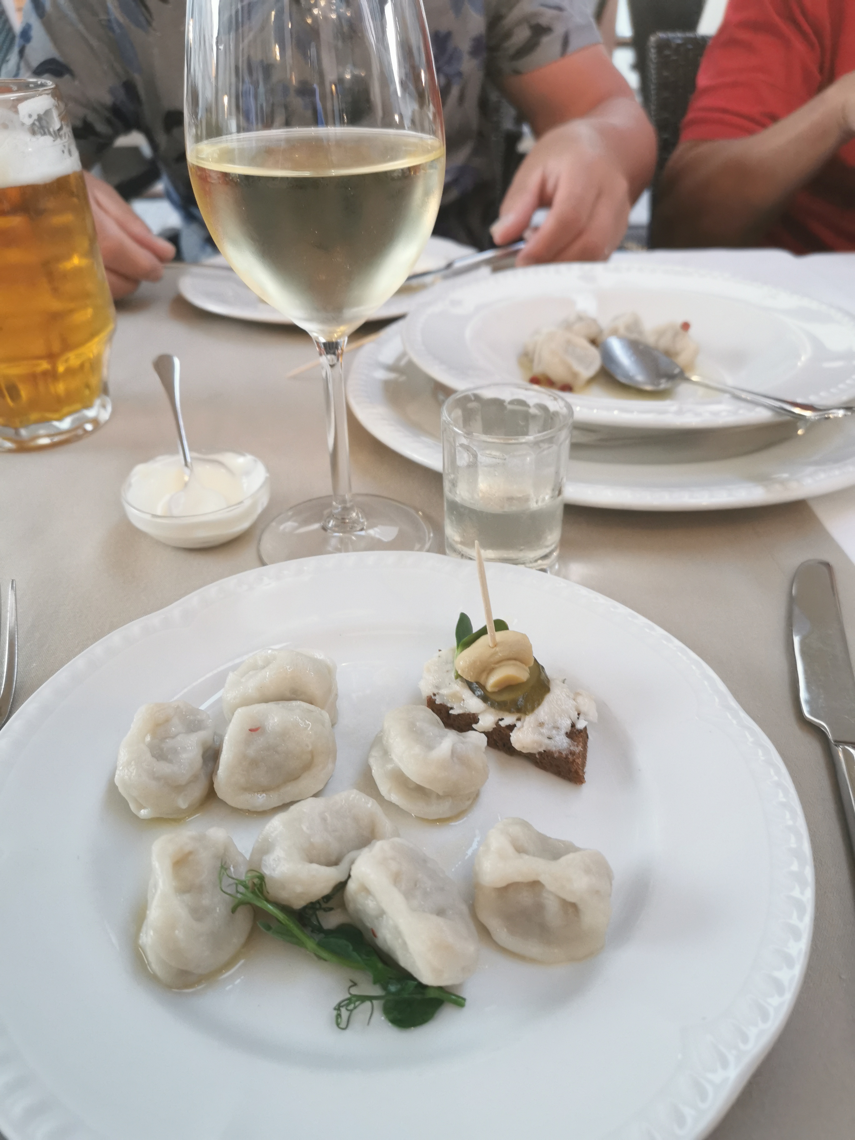 Ystävämme Teijan sukua asuu Venäjällä ja hän ehdotti että syötäisiin illallisella pelmenejä jotka ovat venäläisen keittiön klassikkoruokaa. Pitkän etsinnän jälkeen löysimme vanhasta kaupungista huippu ravintolan jossa nautimme näitä lihaisia nyyttejä jotka muistuttavat paljon italialaisia ravioleita. Tarjoilu ravintolassa oli huippuluokkaa. Vahva suositus tähän ravintolaan.