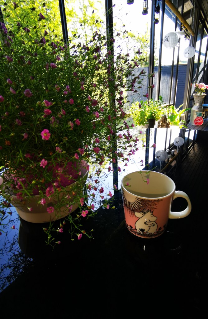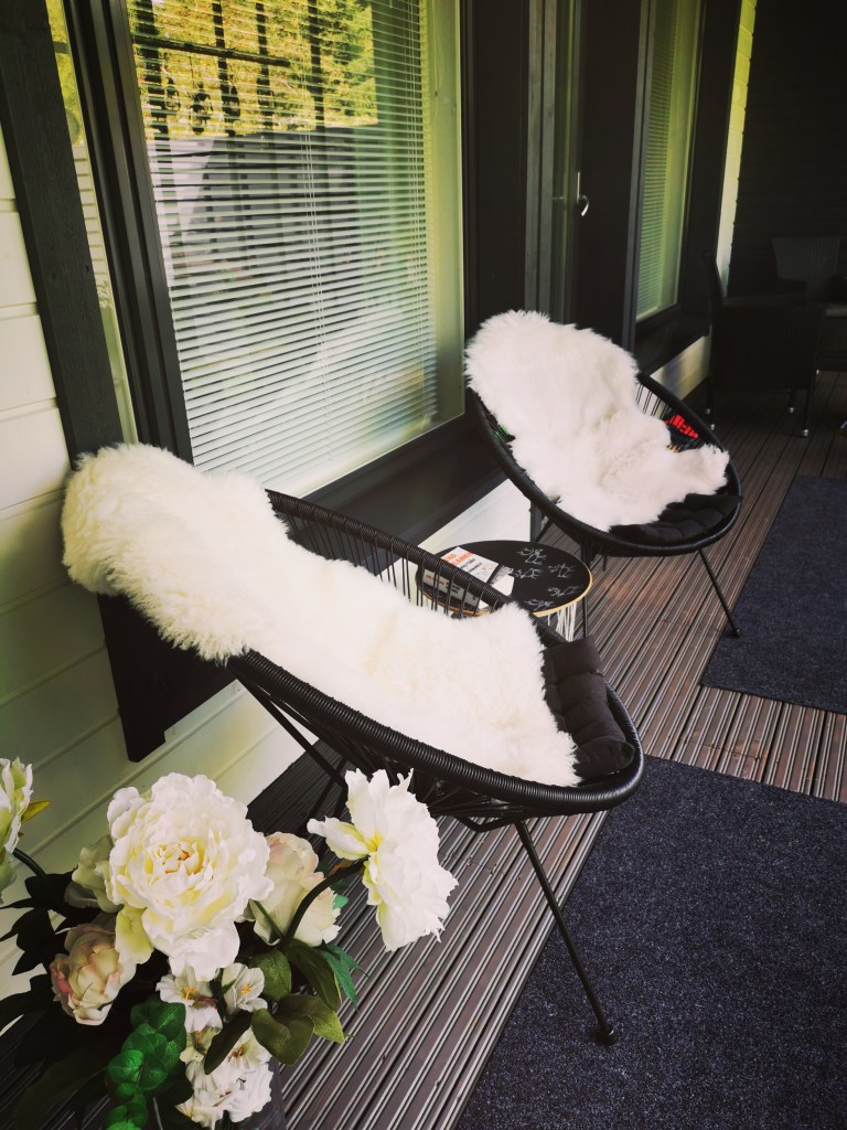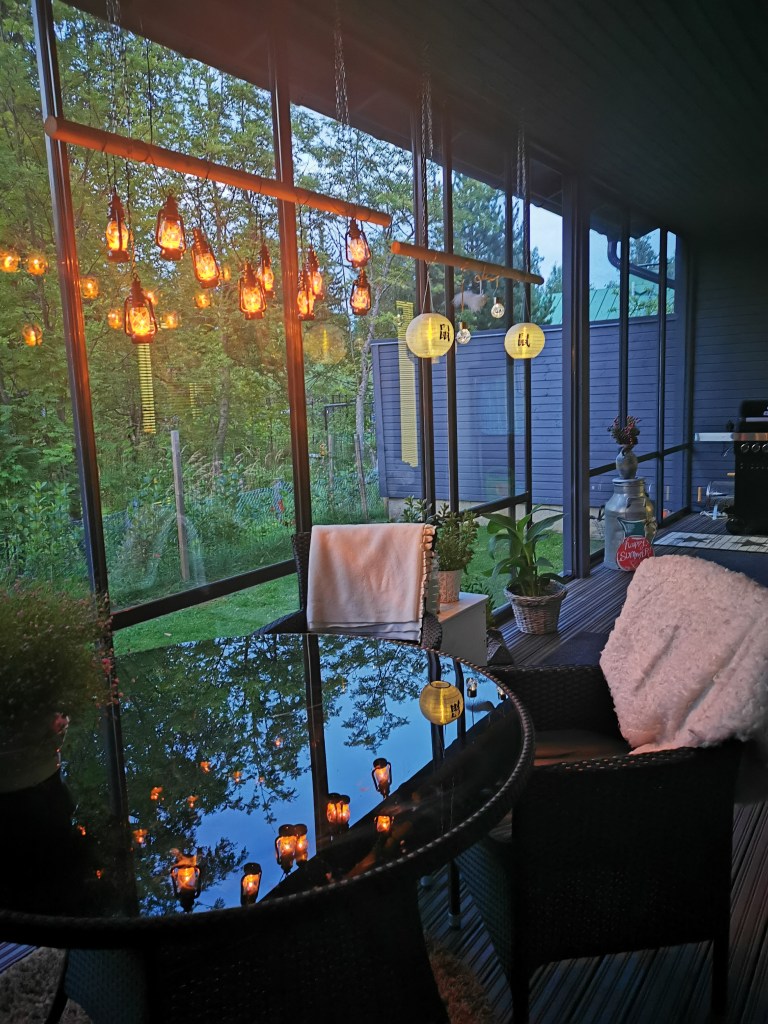 Arki oloissa vietämme paljon aikaa kotosalla joten kotiin liittyvät asiat ovat minulle rakkaita. Uuden asunnon myötä saimme upean lasitetun terassin jota olin jo Kuusamon kotiin haavellut. Terassi on ollutkin meille mieluisa paikka. Lämpimillä keleillä ulko-ovi terassille on ollut kokoajan auki joten siellä tulee piipahettua useasti päivän aikana. Yksi parhaista hetkistä on kun saunan jälkeen pääsee hetkeksi vilvoittelemaan terassille. Katettuna tilana siellä voi istua säällä kuin säällä.