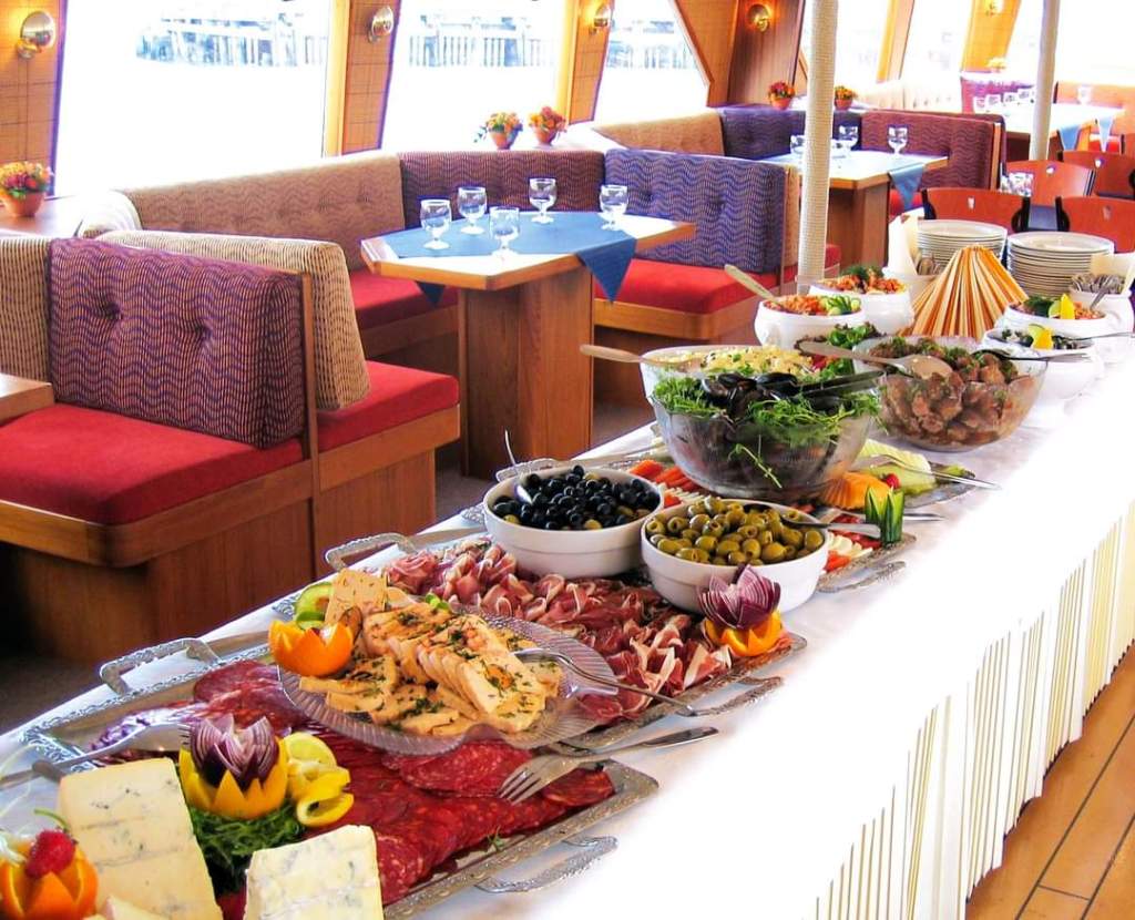 Laivan illallinen tarjoiltiin osin buffet pöydästä ja osin pöytiintarjoiltuina. Alkupalapöytä oli katettu buffettiin ravintolasalin keskelle. Kalapainoitteinen pöytä oli täydellinen jonka kruunasi saaristolaisleipä katkarapujen kera. Pääruoka ja jälkiruoka oli pöytiintarjoiltuina. Ruoka oli erittäin hyvää ja annokset olivat runsaita.