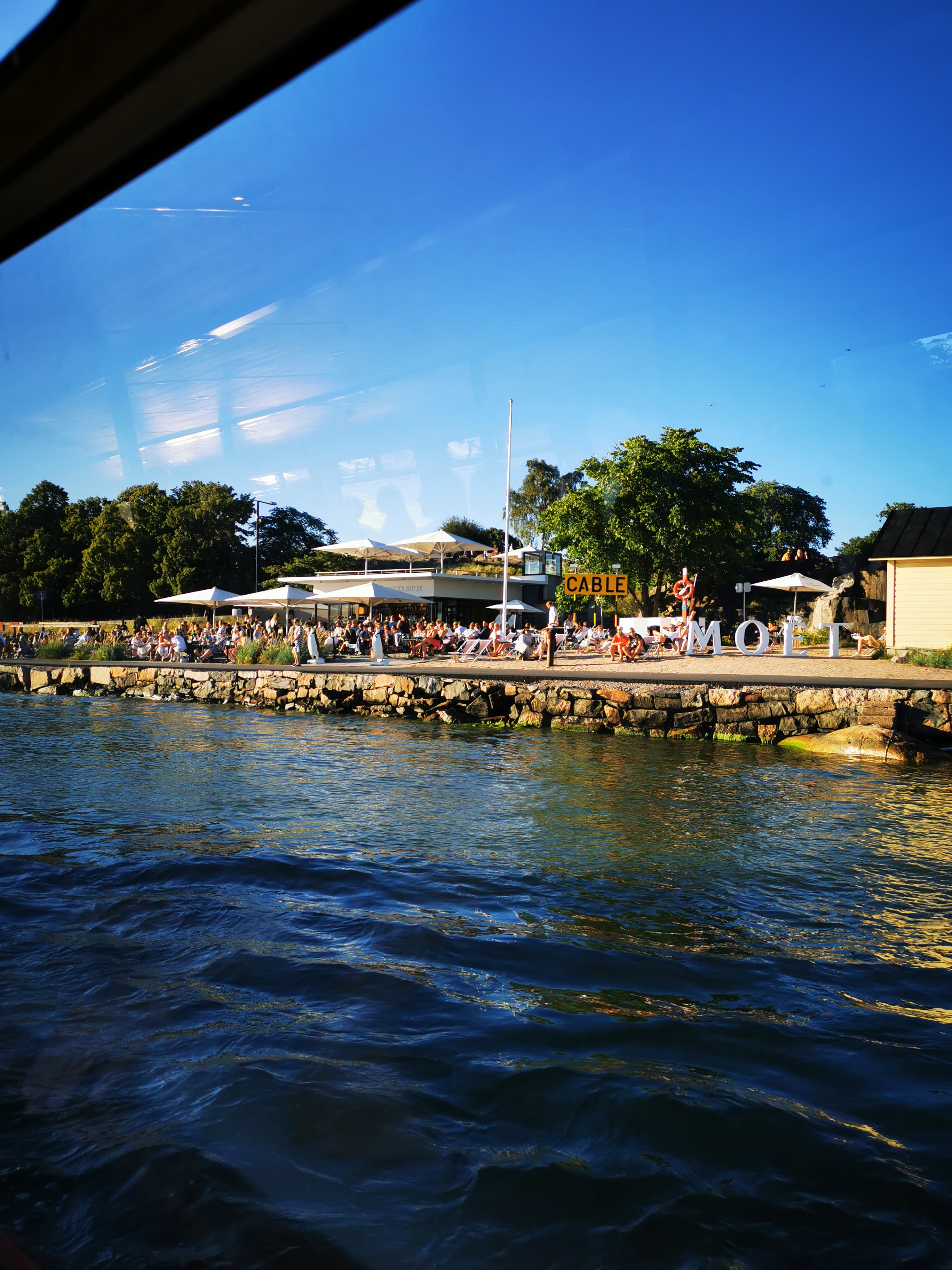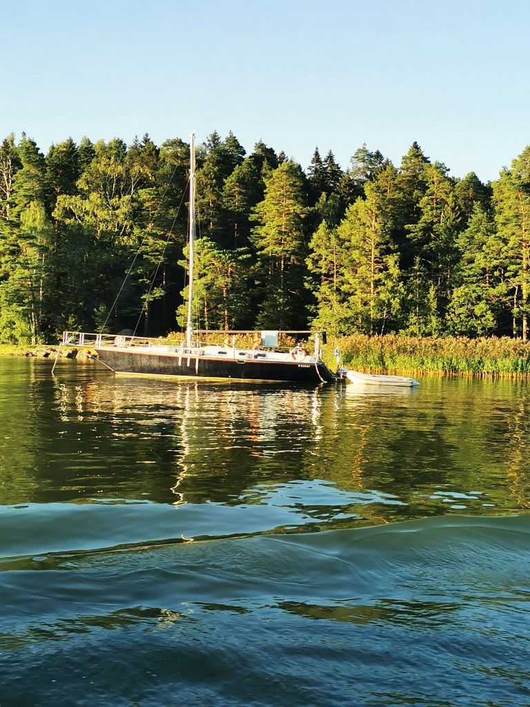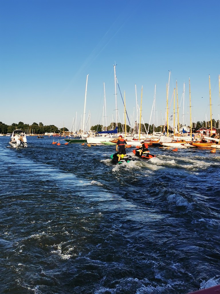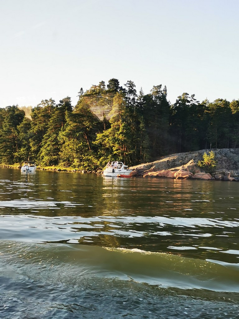 Maisemat vaihtui ja oli mielenkiintoista katsoa eri paikkoja mereltä käsin. Helle oli saanut paljon ihmisiä rannoille, kallioille ja rantaterasseille. Upeat yksityiset alukset lipuivat merellä. Osa oli laittanut veneen ankkuriin lahdenpoukamaan ja nauttivat täysin rinnoin kansipaikoilla auringonlaskiessa mailleen. Hyväntuuliset veneilijät vilkuttivat meille kun risteilyalus lipui kohti merta. Voin vain kuvitella kuinka oman veneen omistajat nauttivat täysin siemauksin elokuun hellepäivästä omalla aluksella.