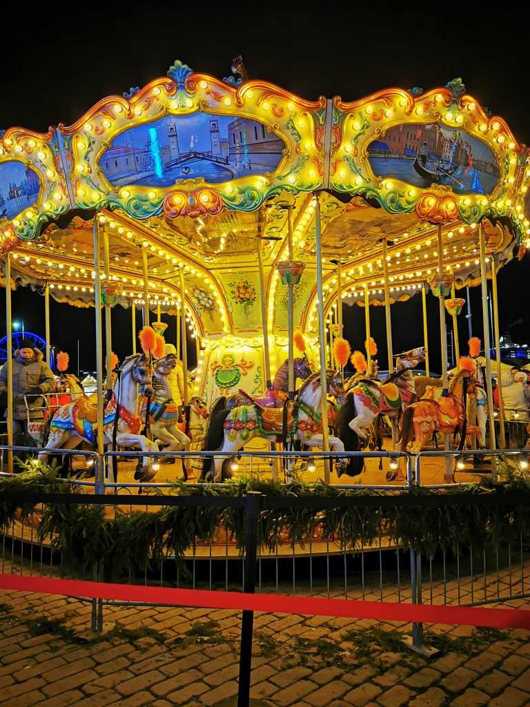 Hyppäsimme Vallilasta raitovaunuun, joka kuljetti meidät suoraan Senaatintorille. Siitä kävelimme vain yhden kadunverran alaspäin ja olimmekin jo Tuomaan markkinoilla. Paikka sopi hyvin kauppatorille. Juuri tänä päivänä, milloin me kävimme, oli Helsingissä pakkasta -17 astetta. Kylmä tuuli meni kyllä luihin ja ytimiin, kun saavuimme perille. Markkinat oli jaettu kahteen eri alueeseen. Ensimmäisellä alueella oli ns. ravintolapuoli, joka oli aidattu anniskelun takia omaksi osaksi. Ihmisiä oli liikkeellä sopivasti, ei liian paljon. Mukava puheensorina täytti alueen. Menimme melkein ensimmäiselle kojulle ja ostimme siitä perinteiset glögit. Perinteinen glögi maistui hyvältä ja samalla lämmittelimme sormia kuuman glögimotin kyljessä. Ostimme jossain kohtaa toisenkin glögin ja se olikin maultaan voimakkaampi. Yritimme mieheni kanssa arvuutella mitä makuja löytyy ja molemmat tulimme siihen tulokseen, että glögi oli tehty viinimarjamehuun, siinä maistui musta- ja punaherukka. Juoman jälkeen siirryimme toiselle alueelle, jossa meitä vastaanotti ihan huikea karuselli. Karusellin musiikki kuului pitkälle ja kuten arvata saattaa niin lapset olivat mielissään jo sen nähdessään mutta vielä riemuisampi ilme oli, kun he pääsivät karusellin kyytiin.