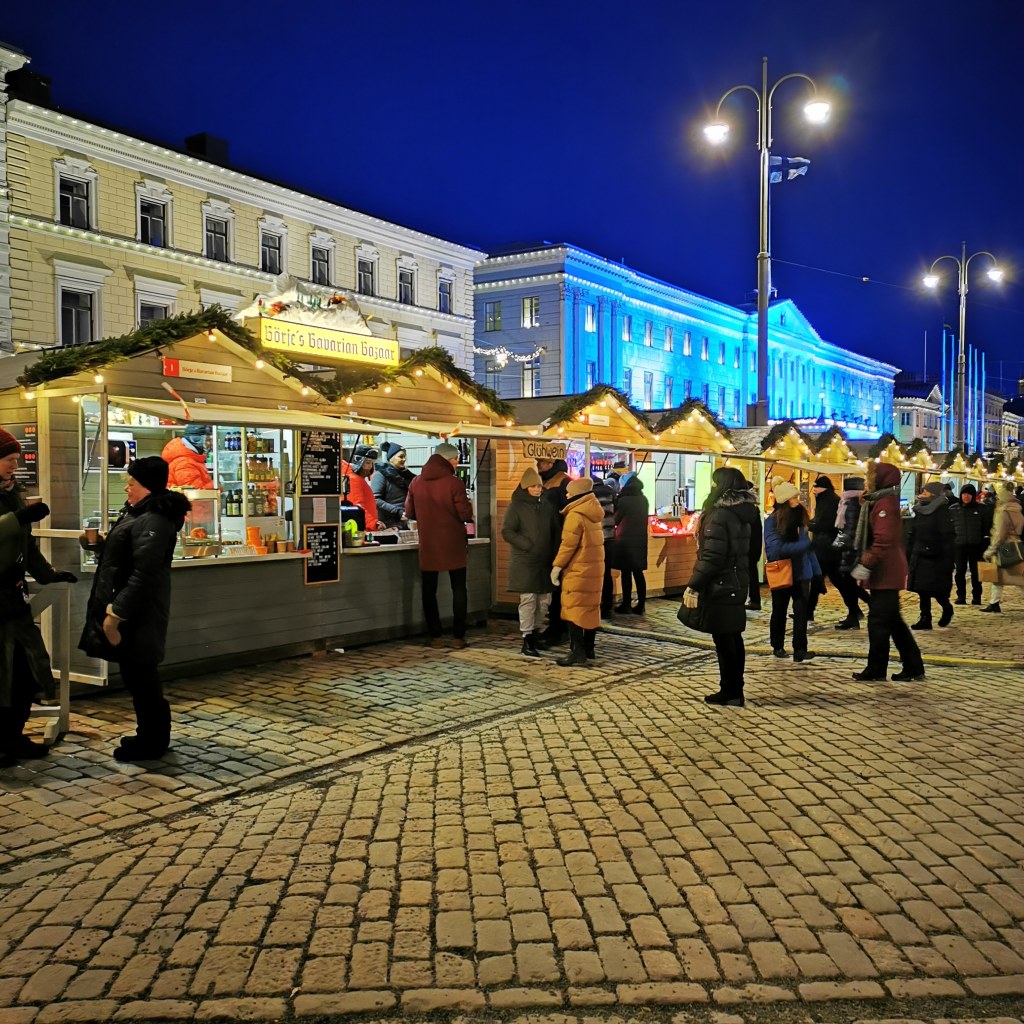 Kävelimme pienten herttaisten kojujen läpi aika nopeasti koska pakkanen teki tehtävänsä ja olimme tässä kohtaa jo aika jäässä, vaikka olimme pukeutuneet todella hyvin. Meren läheisyys teki ilman vielä kipakammaksi, joten paikalleen ei voinut jäädä pitkäksi aikaa. Mitään suuria ostoksia tämän vuoksi emme tehneet mutta lämmin glögi ja markkinatunnelma riitti meille hyvin. Kun olimme liikkeellä päivää ennen itsenäisyyspäivää, niin kävimme vielä ihailemassa Presidentinlinnaa koska se loisti kauniisti pimeässä. Joka pienessä ikkunassa oli kaksi kynttilää.