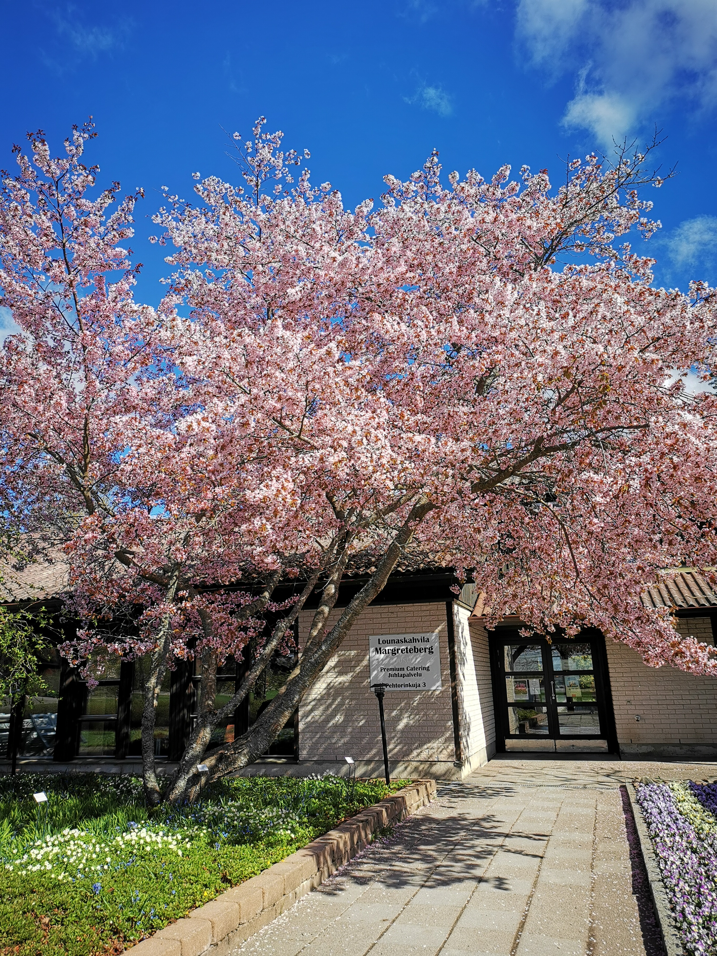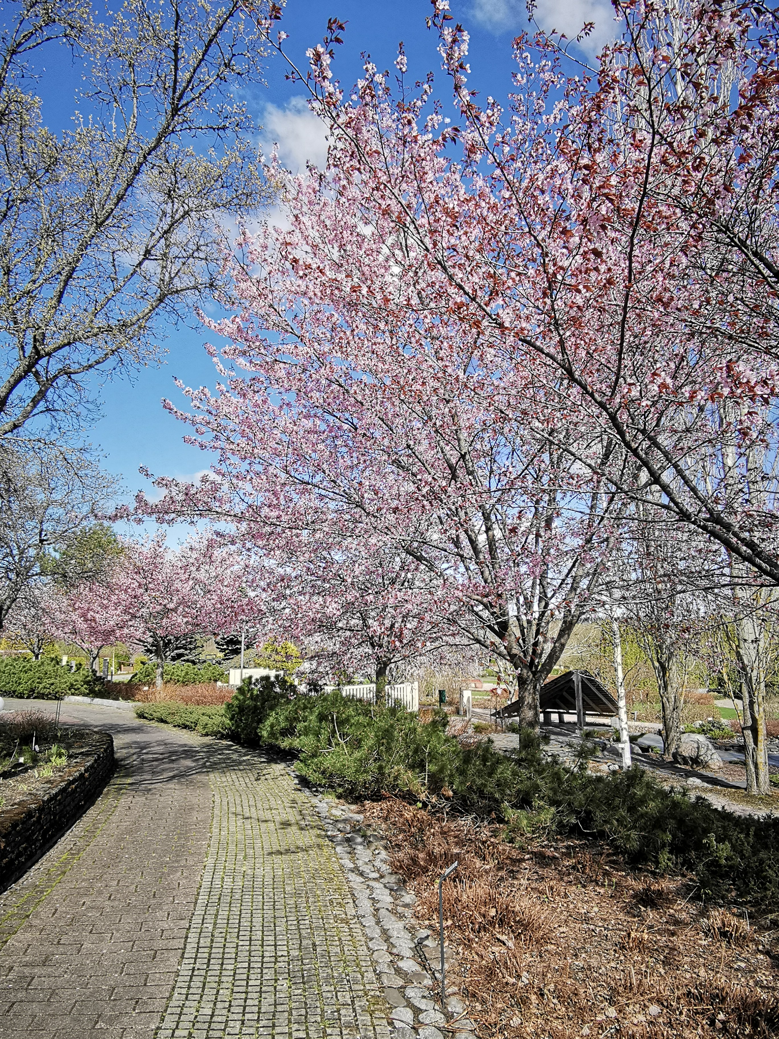 Alue on niin laaja, että vaikka olen vieraillut siellä useaan otteeseen niin aina kohdalle tulee uusia juttuja. Vaikka puistossa on paljon piharakentamiseen liittyviä esittelykohteita niin itselle kukat, pensaat ja puut ovat se juttu. Puistossa on paljon yksi- ja monivuotisia kasveja. Kun kevät saapuu niin puisto herää eloon. Upeat tulppaanit ja narsissit puhkeavat kukkaan sekä muut kauniit sipulikasvit alkavat kukoistaa. Kevään ensimmäinen kohokohta on kirsikkapuiden kukinta. Juuri niitä lähdin tällä kertaa bongaamaan. Näky oli jälleen upea ja kaunis.