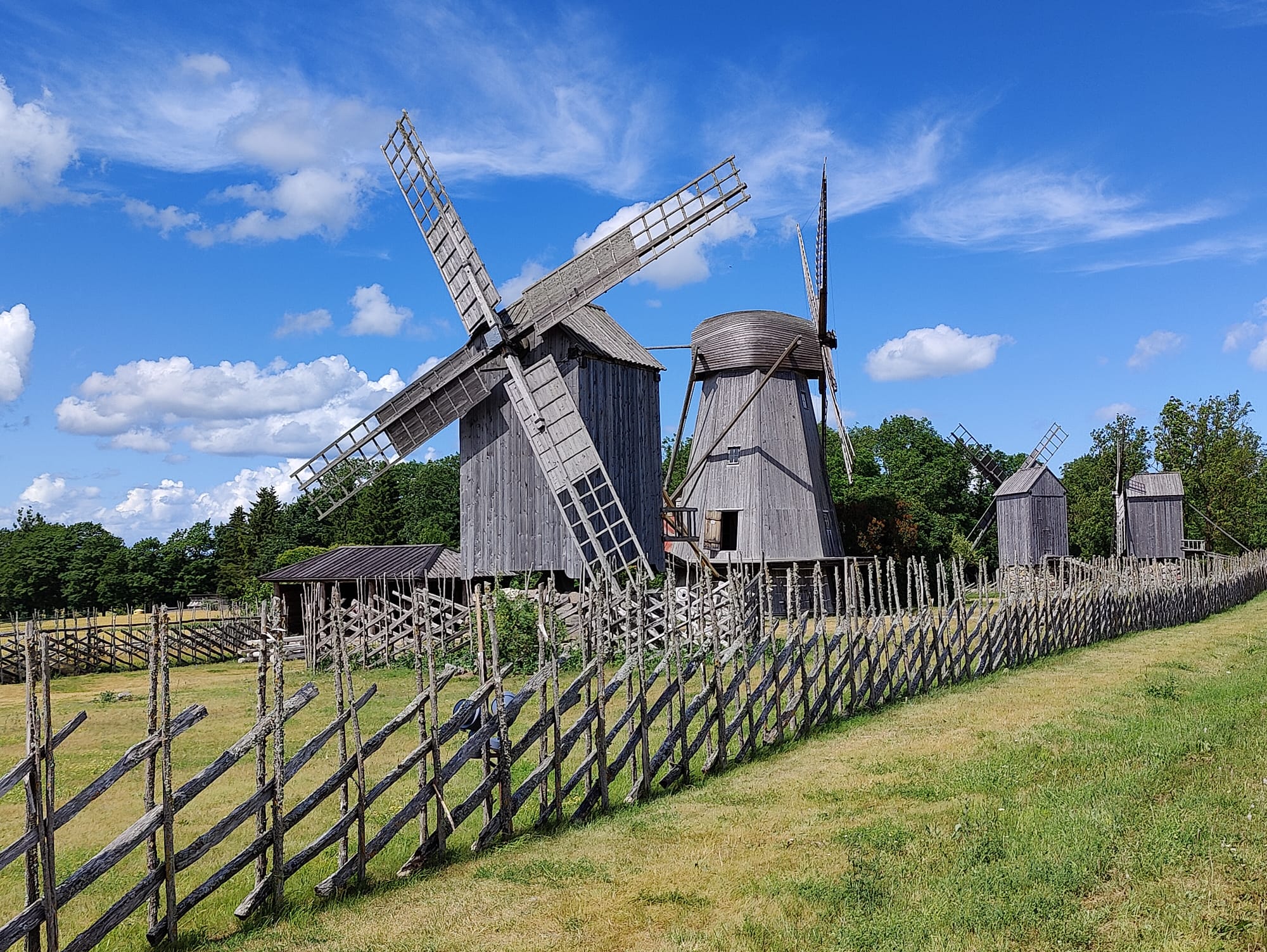 Tuulimyllyt on Saarenmaan tunnus. Toisena kohteena meillä oli Anglan tuulimyllymäki, jossa on jäljellä viisi kunnostettua myllyä. Sinne ajaa kraatterilta vartin ja Kuressaaresta puolisen tuntia. Pihapiirissä on myös perinnekulttuurikeskus jossa voi osallistua erilaisiin työpajoihin. Alueelle on pääsymaksu. Me ihastelimme tuulimyllyjä aidan takaa josta myllyt näkyikin hyvin. Kauniita ne olivat ja ehdottomasti käymisen arvoinen paikka.