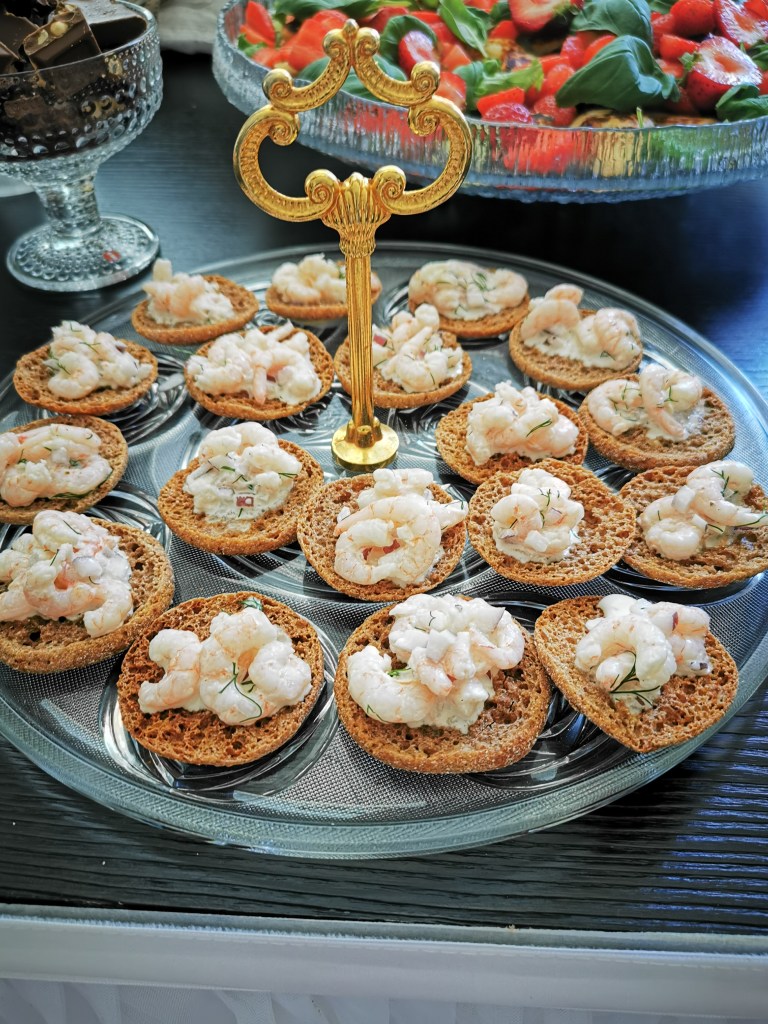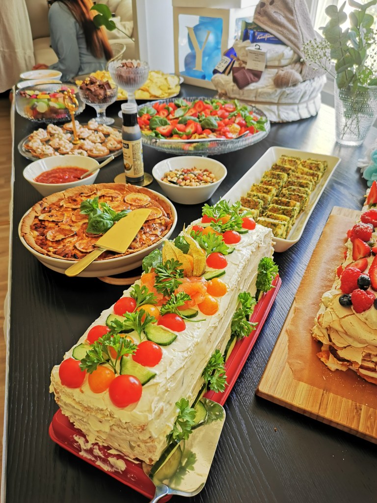 Olimme keränneet yhteisen rahasumman jolla oli ostettu tilaisuuteen pientä tarjottavaa. Osan herkuista leivoimme itse. Minä toin tarjoilupöytään itsetekemäni voileipäkakun. Pöydän antimet oli runsaat ja syötävää oli paljon tarjolla. Kattaus oli myös erityisen kaunis.