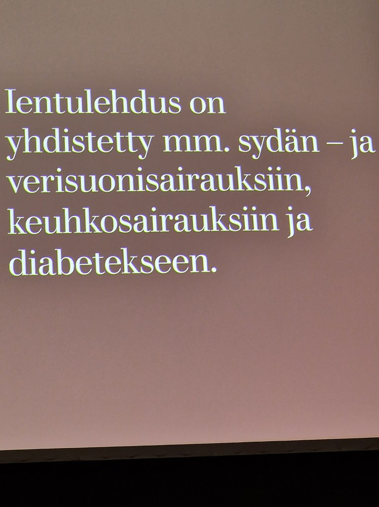 Toinen luento oli todella mielenkiintoinen. Luennon piti Pekka Ruuska suunterveyden vaikutuksista. Kukapa arvaisi, että suusairaudet ovat todella suuri riski erilaisiin tauteihin. Esimerkiksi ientulehdus on flunssan jälkeen toiseksi tavallisin infektiosairaus. Suun tulehdus synnyttää elimistöön tulehdustilan ja voi vaikuttaa kroonisiin sairauksiin. Minun silmät kyllä avautuivat tämän luennon myötä ja päätin että pidän hampaistani hyvää huolta ja käyn säännöllisesti tarkastuksissa.