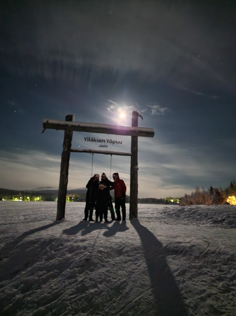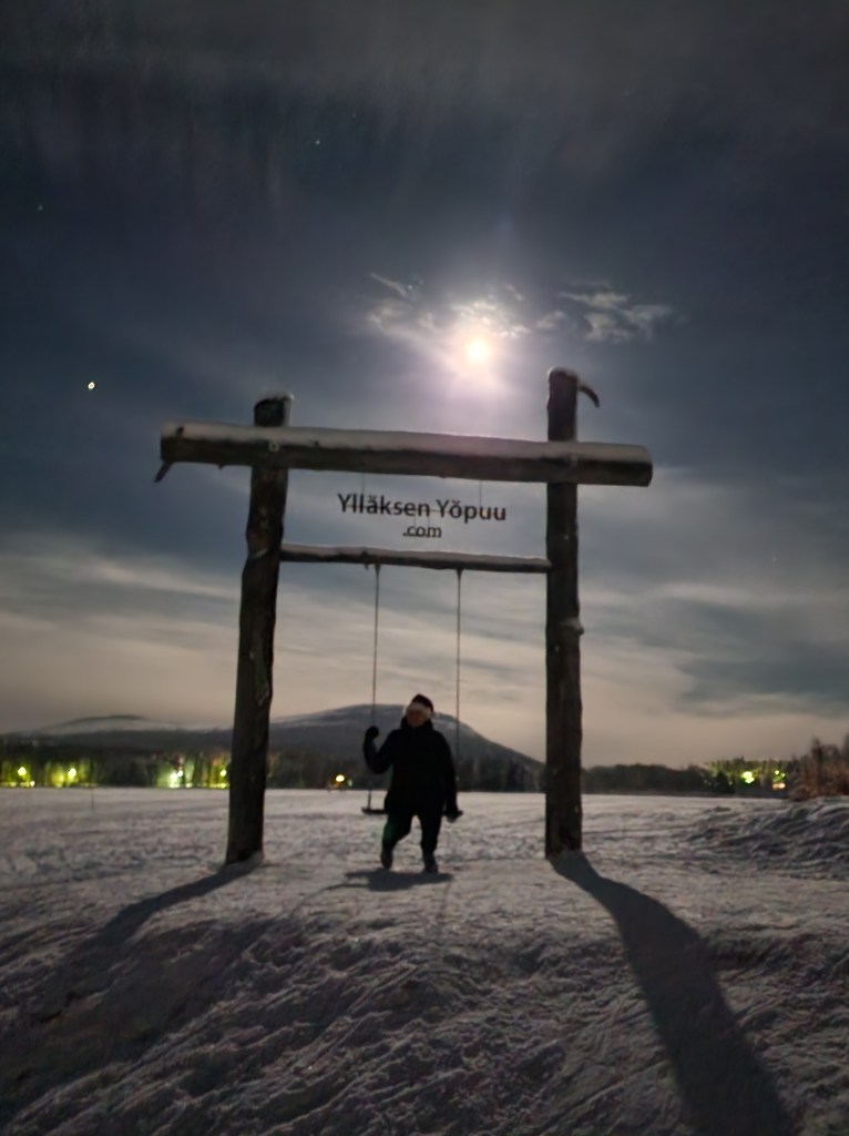 Keinulle pääsee kun kävelee Jounin kaupalta Äkäslompolojärveä kohti. Sää suosi meitä tälläkertaa, keli oli kirkas ja täysikuu valaisi meille tietä. Keinu on rakennettu pienellen saarekkeelle ja se kohoaa hiukan veden yläpuolelle. Ylläs-Swing on tarkoitettu kaikille ja sinne on vapaa pääsy. Otimme hienoja kuutamokuvia ja nautimme lämpimät juomat paikan päällä. Tämä on myös paikka jossa voi ihailla revontulia, tällä kertaa niitä ei näkynyt.