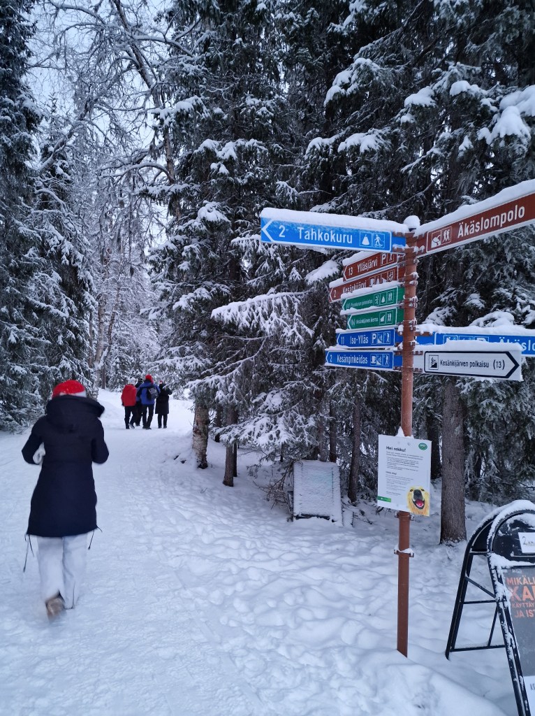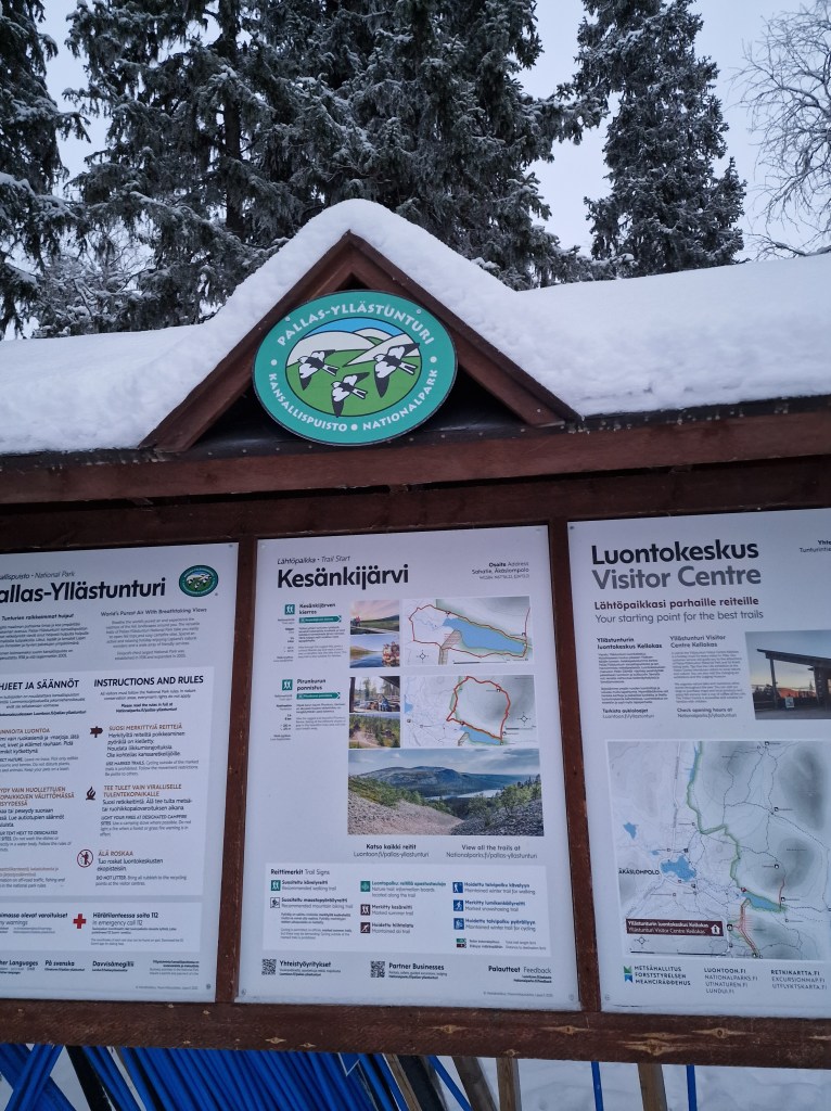 Toisena päivänä lähdimme ulkoilemaan hiukan pidemmälle. Suuntasimme kohti Kesänkijärven laavua. Ensin ajoimme autolla läheiselle parkkipaikalle, jonka jälkeen laitoimme reput selkään ja lähdimme kulkemaan leveää metsäpolkua. Helppokulkuinen polku oli hyvä kävellä ja matkalla maisemat olivat lumoavat. Kauniit lumiset puut tekivät maisemasta kauniin. Nyt oli sen verran sumuinen päivä, että Kesänkitunturi ja Kellostapuli tunturit jäi näkemättä.