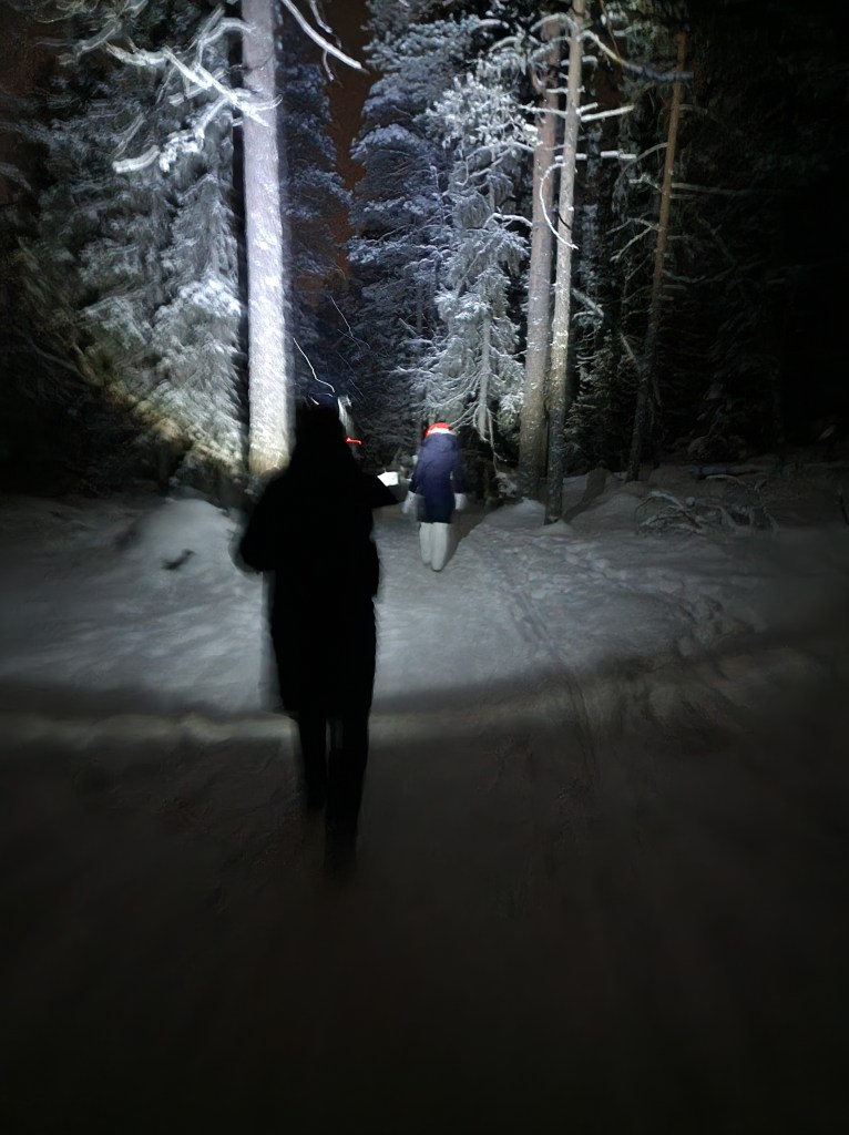 Kun saavuimme laavulle niin valoisa aika alkoi laskeutumaan ja sytyttelimme tulia sinisenhetken aikaan. Laavuja oli kaksi, yksi kotamainen ja toinen iso ulkolaavu. Paistoimme makkarat ulkolaavulla ja ihailimme maisemia nuotiotulen äärellä. Takaisin päin kuljimme otsalamppujen valossa taigametsän siimeksessä. Meillä oli tonttulakit päässä ja kännyksästä kuuntelimme joululauluja. Ihan kuin olisi joulunsatumaassa ollut.