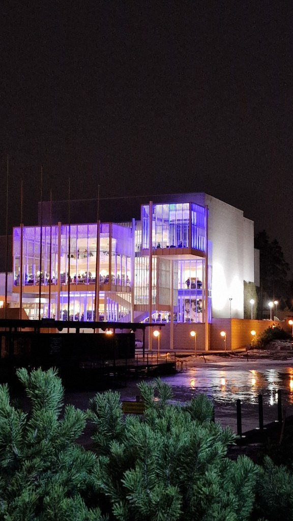 Itse konserttipaikka oli ihan kulman takana hotellistamme. Tapiolan kulttuurikeskus oli iltavalaistuksessa upean näköinen. Lasisten ikkunoiden läpi näki jo kaukaa, että paikalle oli saapunut paljon porukkaa. Suuri aula oli niin iso, että väkimäärä ei mitenkään ahdistanut. Jätimme takin narikkaan ja kävimme ostamassa juomat ennen saliin pääsyä.