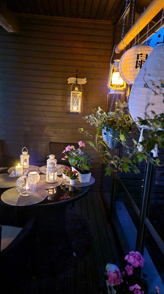 Laita kausivaloja ulos ja kynttilöitä palamaan sisälle. Mikä sen parempaa, kuin ihastella pimeässä loistavia valoja tai nauttia kynttilänvalosta. Itse olen laittanut kausivalon terassille ja joulua kohti mentäessä lisään valojen määrää. Iltaisin ja varsinkin viikonloppuisin laitan ulkoterassille ja sisälle kynttilöitä palamaan.