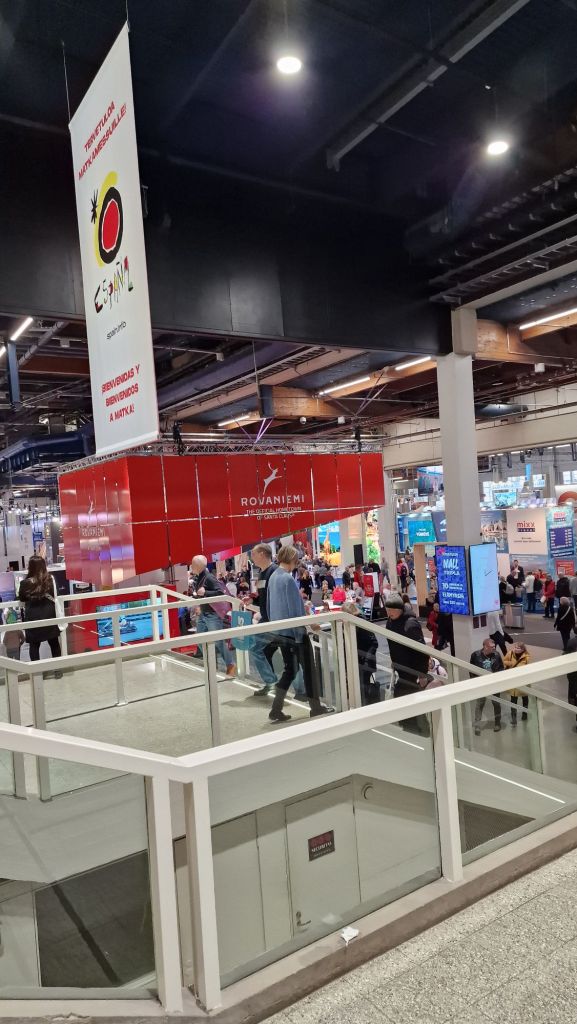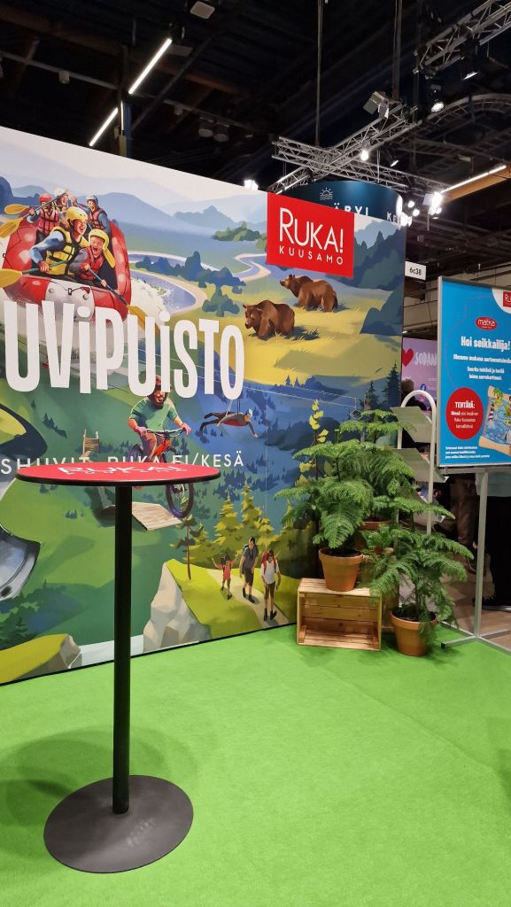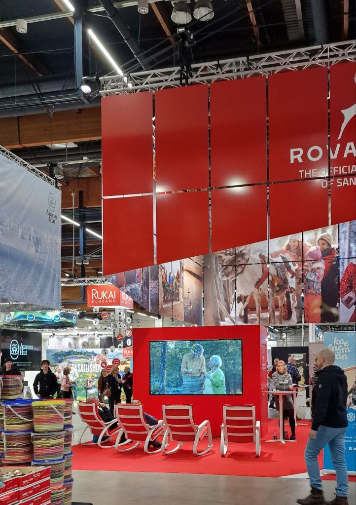 Rovaniemellä oli suuri messuosasto, joka erottui joukosta. Päävärinä oli punainen, joka on elinvoiman väri ja se vetää asiakkaita hyvin puoleensa. Punainen väri sopii kuin nappi silmään, koska Rovaniemi on tunnetusti joulupukin virallinen kotikaupunki. Rovaniemeltä löytyy paljon nähtävää mutta tällä kertaa suuntasimme ensin tutulle Ruka-Kuusamon osastolle.