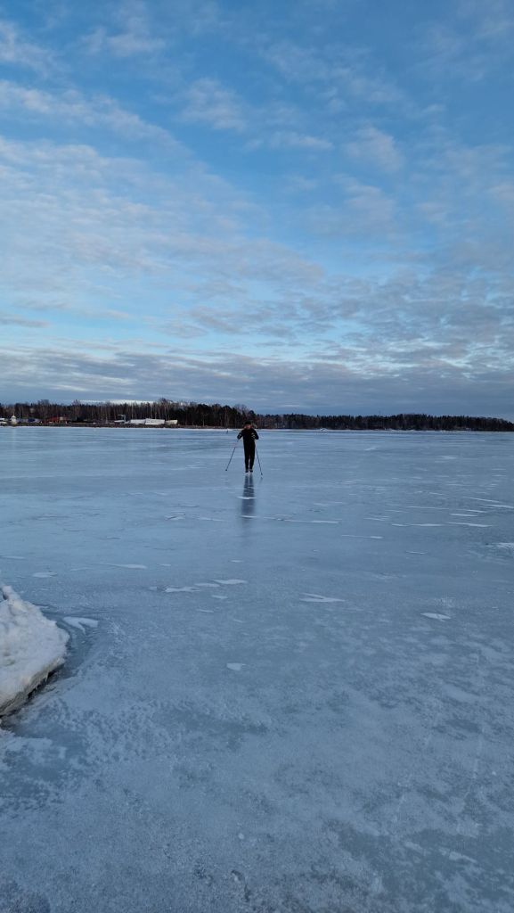 Alkukuusta kävimme merenjäällä kävelyllä. Hieno ilma oli saanut monet muunkin liikkeelle. Meren jää oli peilikirkas, joka on aika harvinaista. Seurailimme lähietäisyydeltä, kuinka retkiluistelijat liukuivat peilikirkkaalla jäällä horisonttiin eväsreput mukanaan.