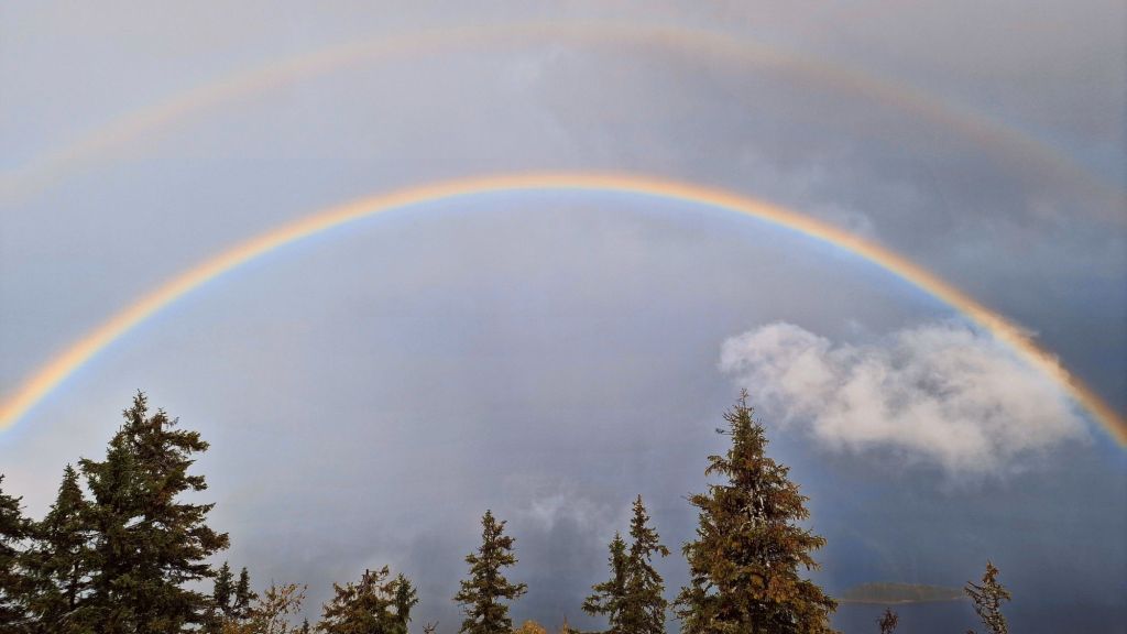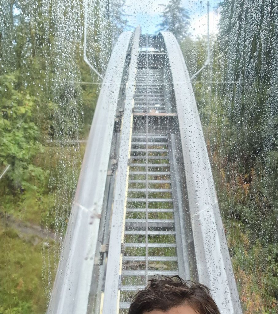 Tässä kohtaa vettä satoi jo aika paljon ja kun olimme perille sitä tuli todella reilusti maahan saakka. Kuten arvata saattaa näkymä ylhäällä oli niin sumuinen, että näkyvyyttä ei ollut lainkaan. Olin niin pettynyt, kun katsoin sumuista maisemaa ja kyyhötin sateenvarjon alla. Ajattelin, että olen tässä niin kauan kuin sade lakkaa ja lähden sitten alaspäin. Mutta kuin ihmeenkaupalla yhtä-äkkiä taivas takanani repesi ja aurinko pilkisti esiin. Vielä kun hetken odottelin, niin kansallismaisema alkoi pikkuhiljaa näkyä edessäni ja upea sateenkaari kaarsi edessäni. Tämä oli niin maaginen hetki, että sitä ei voi oikein sanoin kuvailla. Kaikki vaiva kannatti. Lopuksi lähdin alaspäin ja hyppäsin kiskohissiin, joka toi minut nopeasti alas ja oli jännittävä kokemus.